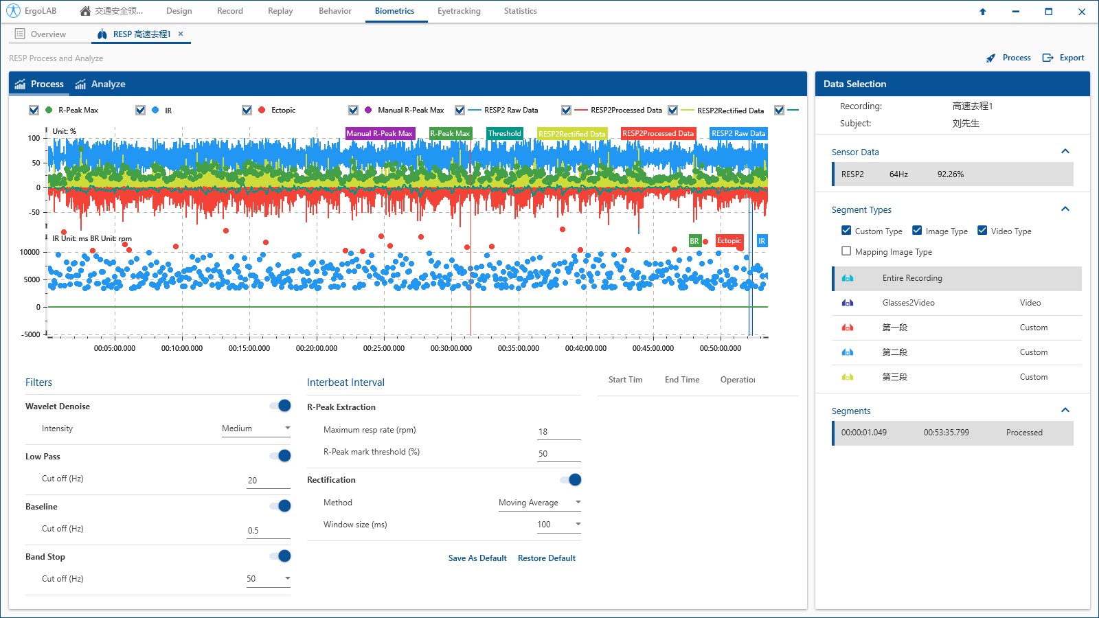 RESP高級數據處理分析模塊可以結合人機環(huán)境同步平臺和生理記錄系統采集到與RESP指標相關(guān)的生理信號進(jìn)行離線(xiàn)處理和分析??蓪π盘栠M(jìn)行自由選擇、放大、縮小,便于瀏覽數據;在整體呈現數據的基礎上,還可以根據片段、事件、場(chǎng)景三種分割方式進(jìn)行數據呈現與分析;可導出ASCII格式的原始數據、處理后數據和分析后數據;并可導出可視化分析報告。