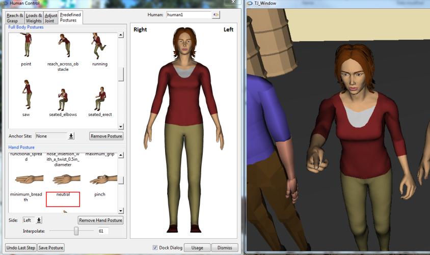 設置您的虛擬人體的姿態(tài)-jack允許你通過(guò)直接操縱關(guān)節或從一個(gè)包含30個(gè)預定義態(tài)勢的庫中選擇來(lái)描述你虛擬人體的姿態(tài)。您可以操縱虛擬人體,通過(guò)移動(dòng)虛擬人的頭部、眼睛、肩膀、軀干、質(zhì)心、骨盆、四肢、腳或其整個(gè)身體。