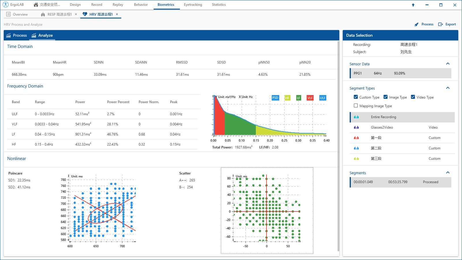 HRV高級數據處理分析模塊可以結合人機環(huán)境同步平臺和生理記錄系統采集到與HRV指標相關(guān)的生理信號進(jìn)行離線(xiàn)處理和分析??蓪π盘栠M(jìn)行自由選擇、放大、縮小,便于瀏覽數據;在整體呈現數據的基礎上,還可以根據片段、事件、場(chǎng)景三種分割方式進(jìn)行數據呈現與分析;可導出ASCII格式的原始數據、處理后數據和分析后數據;并可導出可視化分析報告。