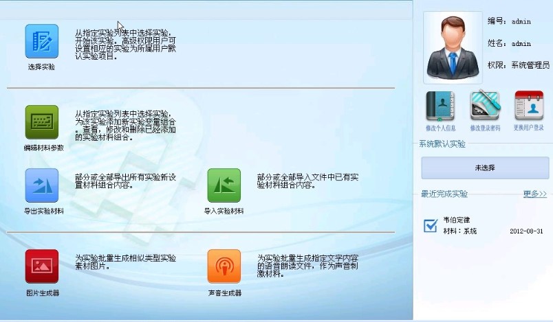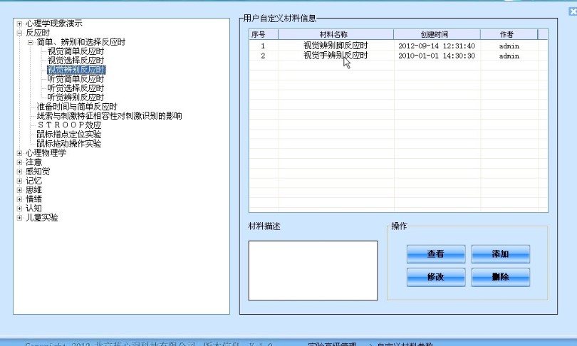 3. 心理 實(shí)驗設計功能:強大的自定義實(shí)驗材料功能,可定制指導語(yǔ)、刺激內容(圖片、語(yǔ)音、文本)、目標刺激的時(shí)長(cháng)和次數、干擾刺激或休息的時(shí)長(cháng)和次數以及反應鍵選擇等實(shí)驗內容,定制完成的材料構成一個(gè)完整的自定義材料組以區別系統默認材料組,用戶(hù)實(shí)驗中可自主選擇不同材料組來(lái)進(jìn)行實(shí)驗。
