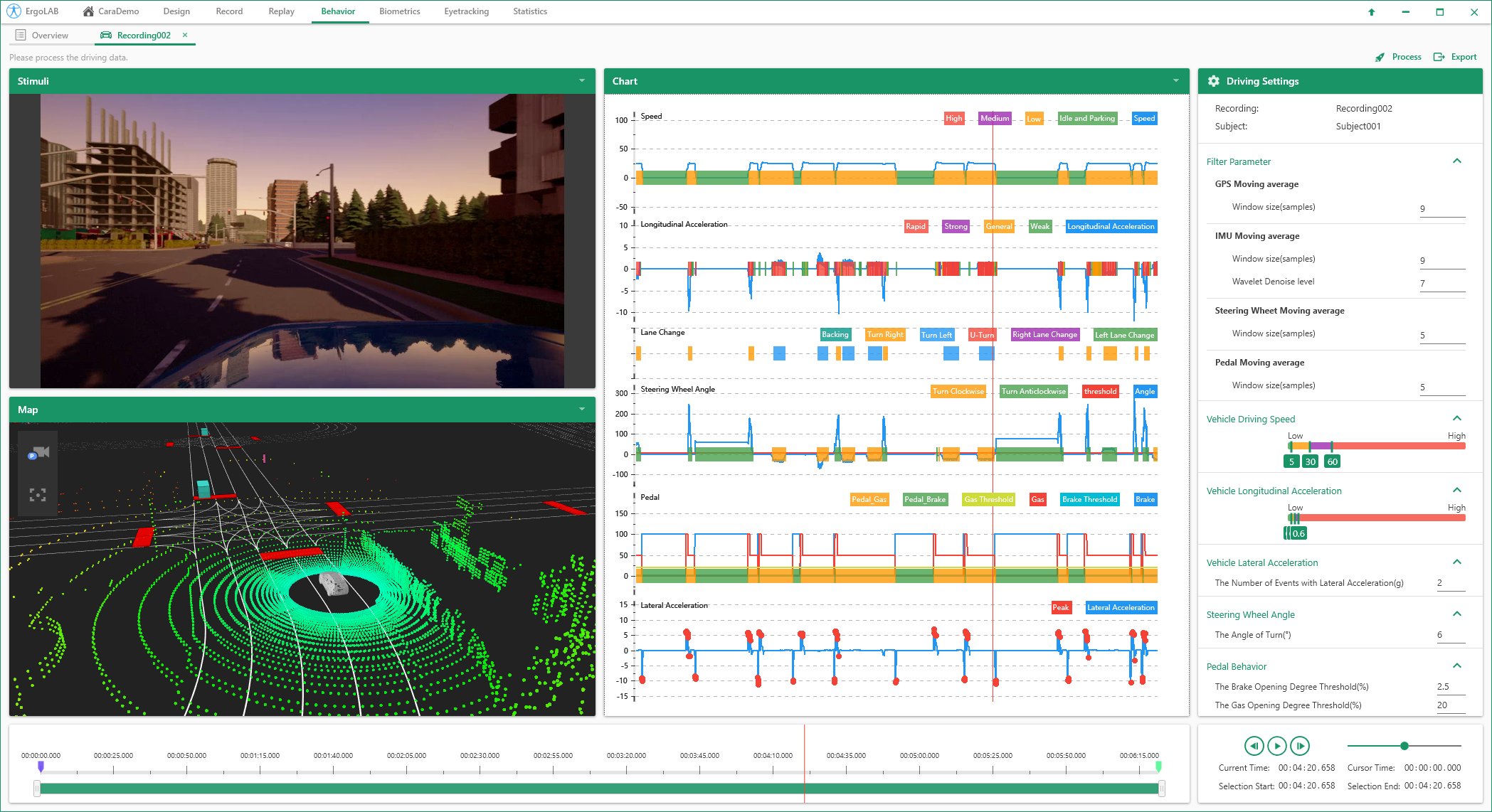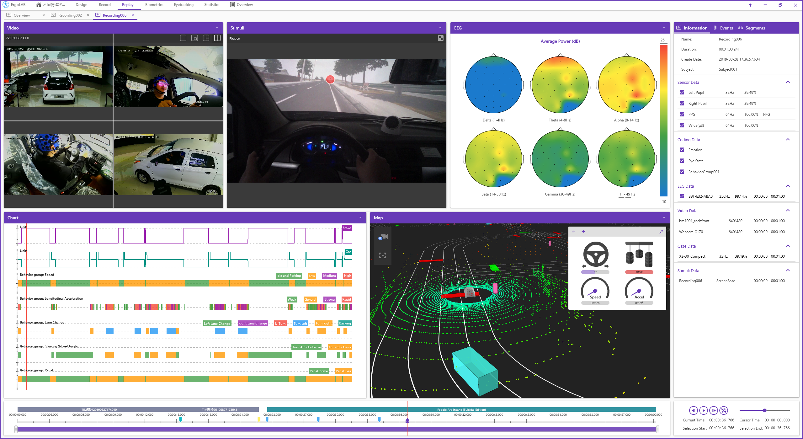 ErgoLAB人機環(huán)境同步云平臺包含強大的數據分析模塊以及廣泛的認知和情感生物特征識別(如記憶,注意力,情緒反應,行為決策,以及警覺(jué)、壓力等)。ErgoLAB數據分析與綜合統計分析模塊包含多維度人-機-環(huán)境數據綜合分析、EEG腦電分析與可視化、眼動(dòng)分析與可視化、行為觀(guān)察分析、面部表情分析、動(dòng)作姿態(tài)傷害評估與工效學(xué)分析、交互行為分析、時(shí)空行為分析、車(chē)輛與駕駛行為分析(ErgoAI駕駛版本)、HRV心率變異性分析、EDA/GSR皮電分析、RESP呼吸分析、EMG肌電分析、General通用信號分析(如SKT皮溫分析、EOG眼電分析以及其他環(huán)境與生物力學(xué)信號分析)。系統具備專(zhuān)門(mén)的信號處理模塊以及開(kāi)放式信號處理接口,可以直接導出可視化分析報告以及原始數據,支持第三方處理與開(kāi)發(fā)。